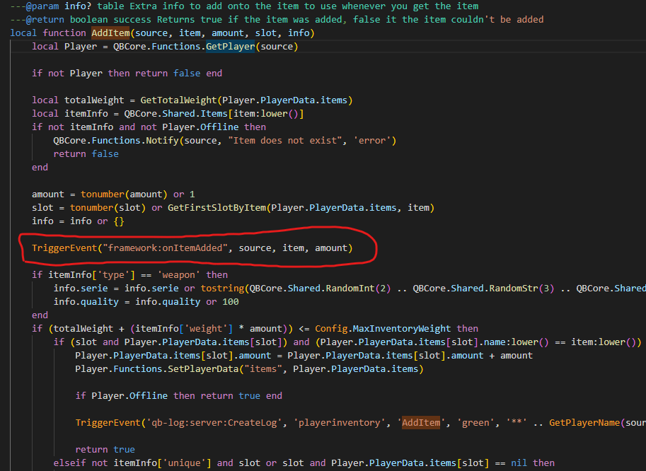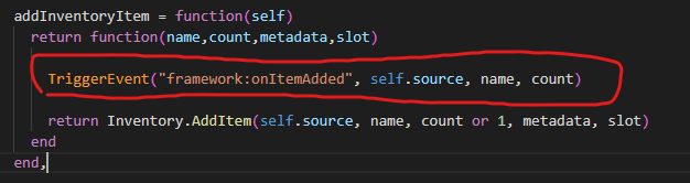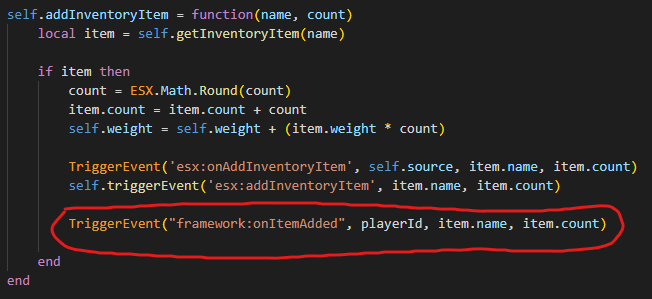 TriggerEvent("framework:onItemAdded", playerId, itemName, itemCount)