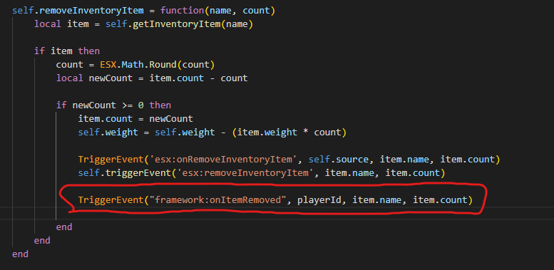 TriggerEvent("framework:onItemRemoved", playerId, itemName, itemCount)